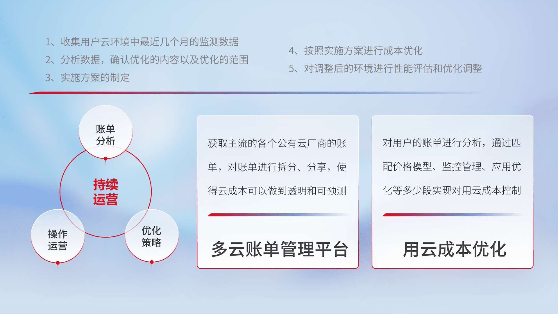 通过多云纳管,,以统一的资源数据模型把客户的云资源进行抽象和封装,,进而实现对多云资源的统一操作,,,,保障云资源管理的可靠性、、、稳定性与可用性。。。量身定制化运维内容,,配置、、、、开发运维、、补丁管理、、、备份、、监控、、认证和访问管理、、、、审计和日常巡检等,,,保障在用云过程中的可靠度,,稳定度以及高可用率。。