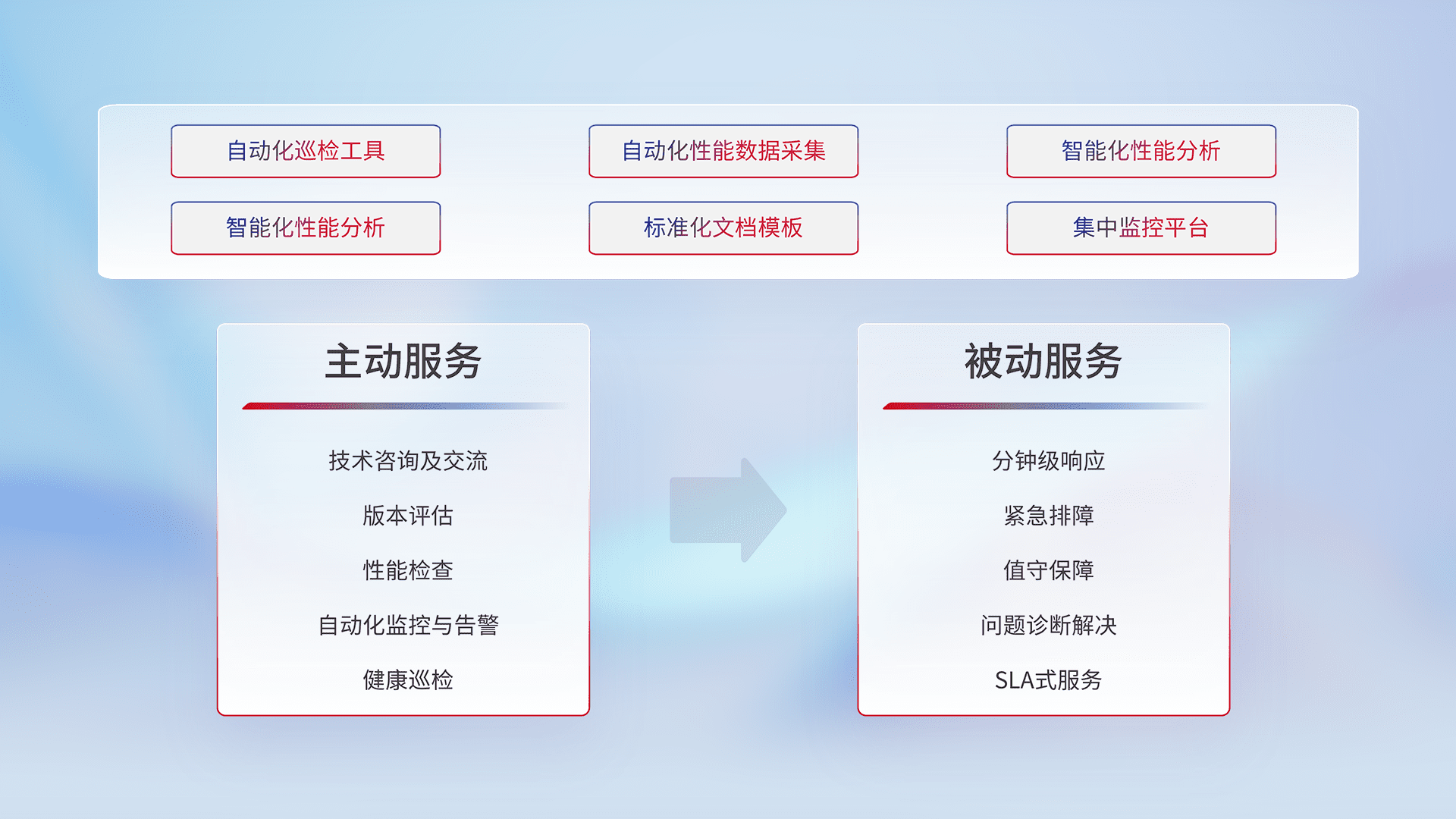 智能化工具和标准化文档,,,保障服务质量,,,,提供主动服务(包含技术咨询、、、版本评估、、、性能检查、、自动化监控与告警、、、健康巡检)和被动服务包含(分钟级响应、、、、紧急排障、、、值守保障、、、问题诊断解决、、、、SLA服务)。。。。